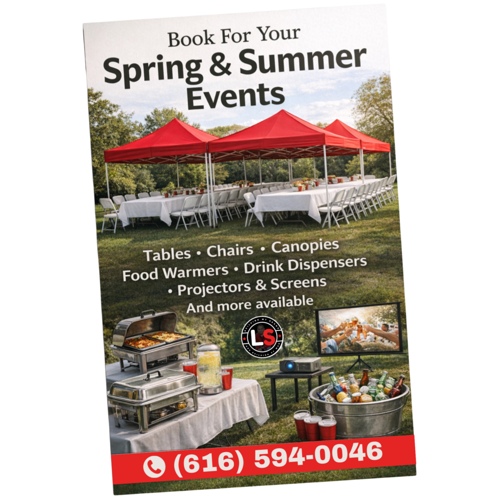 We offer delivery and pick-up services (fee applies) and have packages available for events of all sizes. Our rental options include tables, chairs, food warmers, canopies, beverage holders, PA systems with microphones, DJ packages, HD projectors with screens, beverage dispensers, backdrop stands, easels, and more.